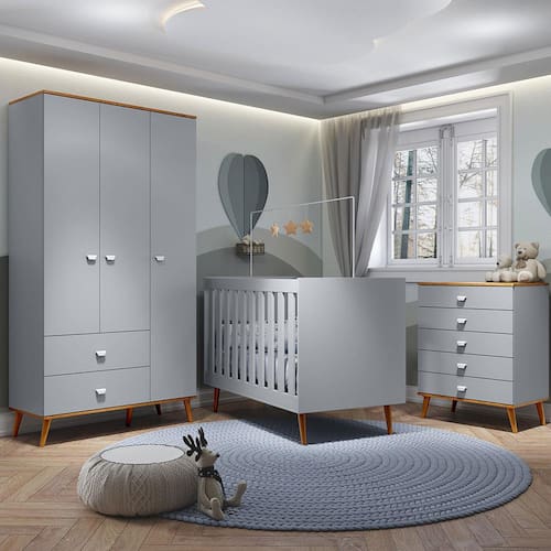 Guarda-Roupa Bartira Ternura com 3 Portas, 2 Gavetas + Cômoda Ternura com 5 Gavetas + Berço Móveis Estrela Ternura - Azul Wood
