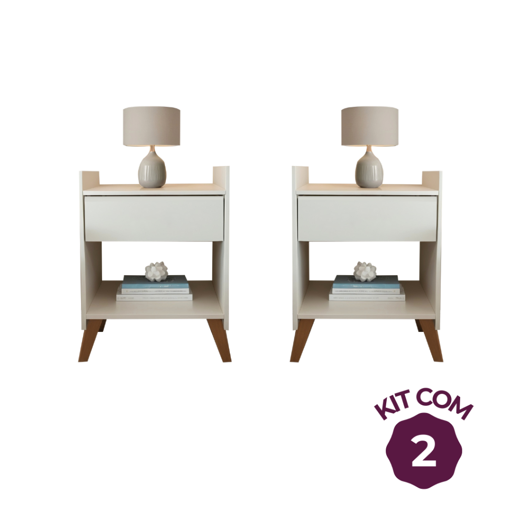 Jogo Quarto Kit 2 Mesa de Cabeceira Compacta Pés Estilo Retrô Mesinha com Gaveta Organizadora Puxador Concha Nicho Decoração Canto Lateral Apoio Aparador Objeto Cama Classic New - RPM