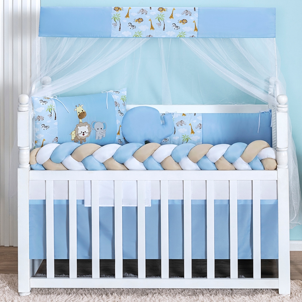 Kit Berço Trança Menino Completo Padrão Nacional E Americano 9 Peças Modelo Tranca Azul Verde Safari Bege Branco Neutro Nuvem Amor Protetor Lateral Berço para bebê Enxoval para berço - Promoção