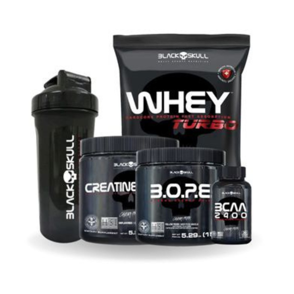 Suplementos - Whey Turbo 900g + Creatina Monohidratada Turbo 150g + Pré Treino B.O.P.E 150g + BCAA 2400 30 Cápsulas + Coqueteleira 600ml - Black Skull
