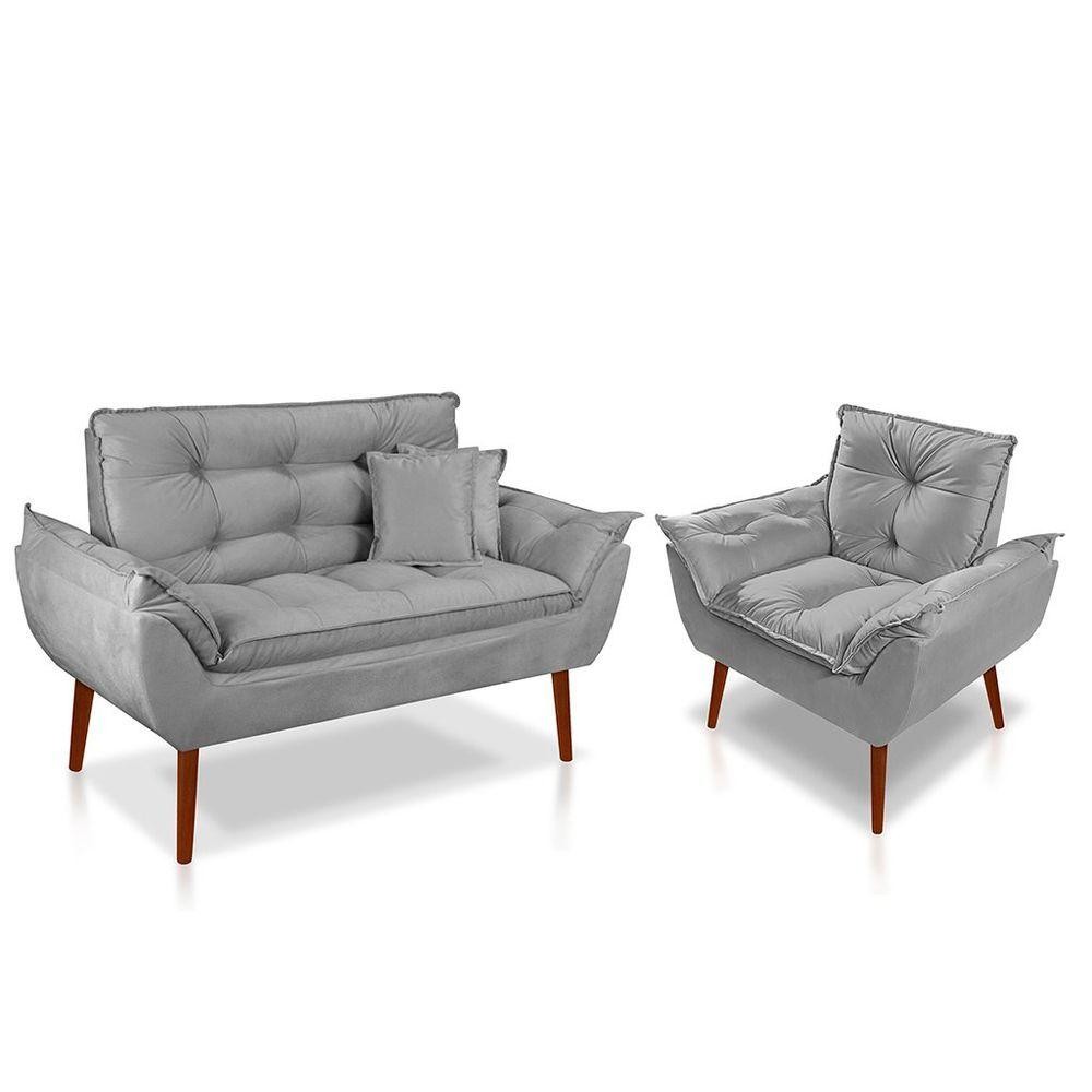 Kit 01 Poltrona Opala + 01 Namoradeira Opala + 02 Almofadas Suede Cinza Claro