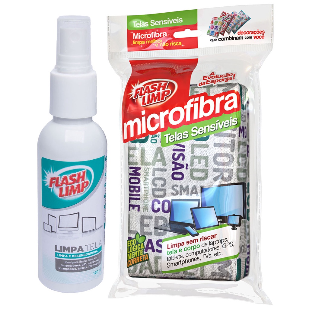 Kit 2 Esponjas Microfibra e 1 Limpa Telas Spray 120ml Flash Limp