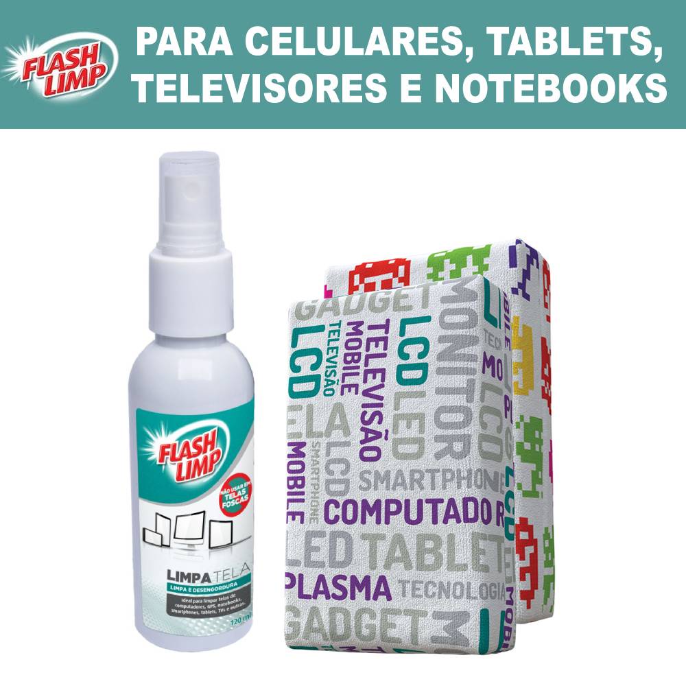 Limpa Telas Notebook Celular Monitor TV Kit Com 2 Esponjas e 1 Limpa Telas 120ML Flash Limp