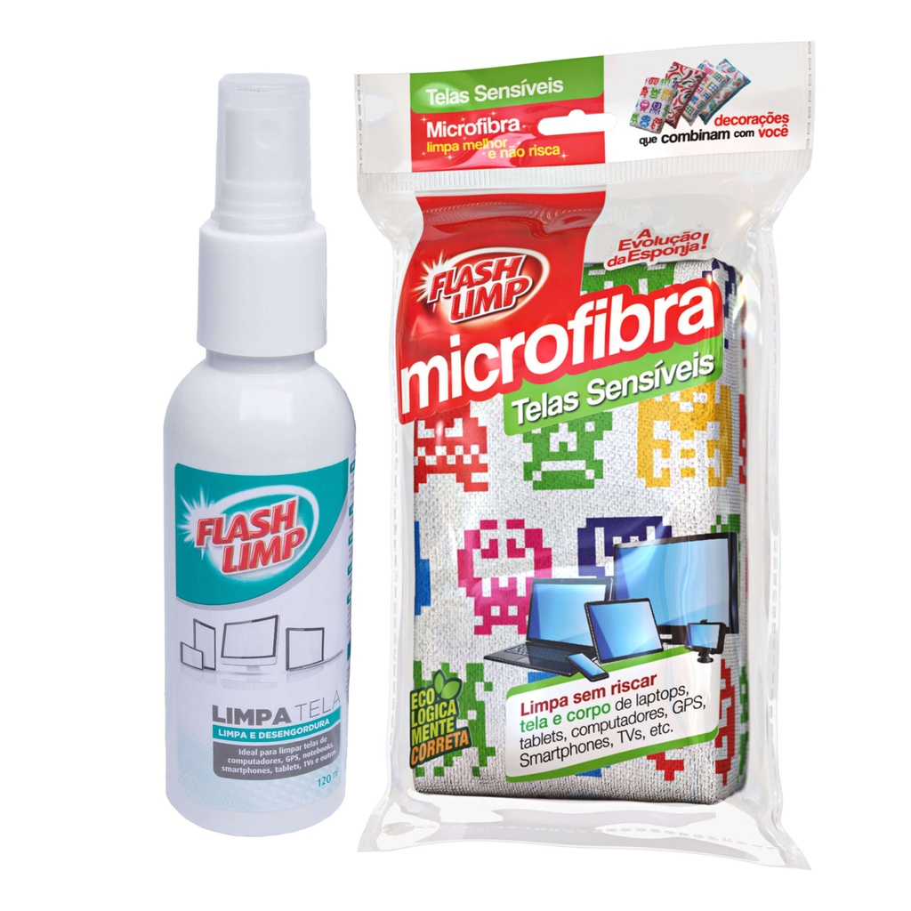Kit com 2 Esponjas Microfibra e 1 Limpa Telas Spray 120ml, Estampas Sortidas, Flash Limp