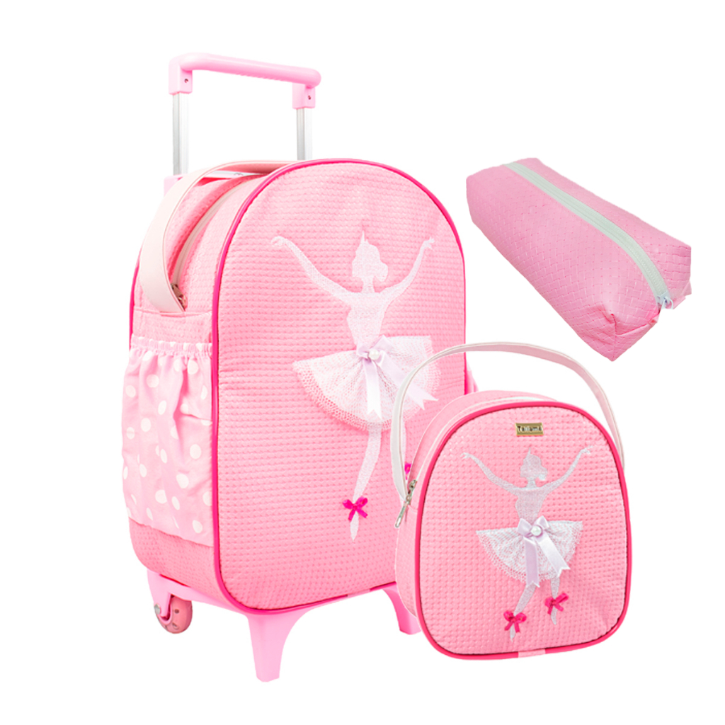 Kit Mochila Infantil Escolar De Rodinhas Skye Turma Da Patrulha Canina Rosa Tam G + Lancheira E Estojo
