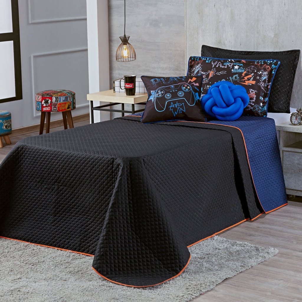 Kit Cama Colcha Infantil Cobre Leito Game Streamer Preto Dupla Face c/ Almofadas Solteiro 05 Peças - DOURADOS ENXOVAIS