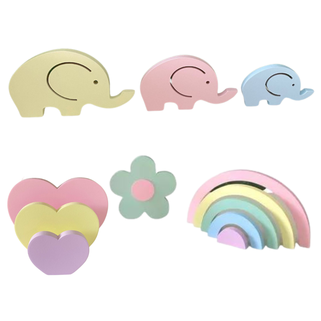 kit decoração de quarto em mdf flor, arco-iris, trio coração e trio elefante