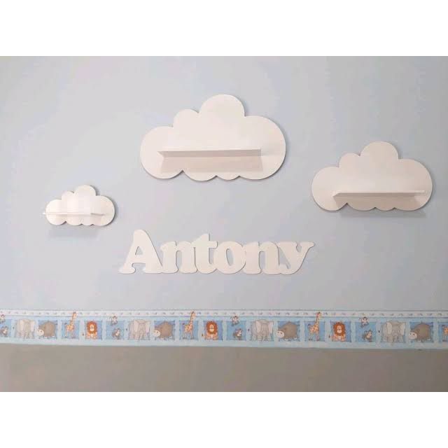 kit prateleira nuvem com nome aplique de parede mdf trio nicho decoração quarto infantil + nome do bebê