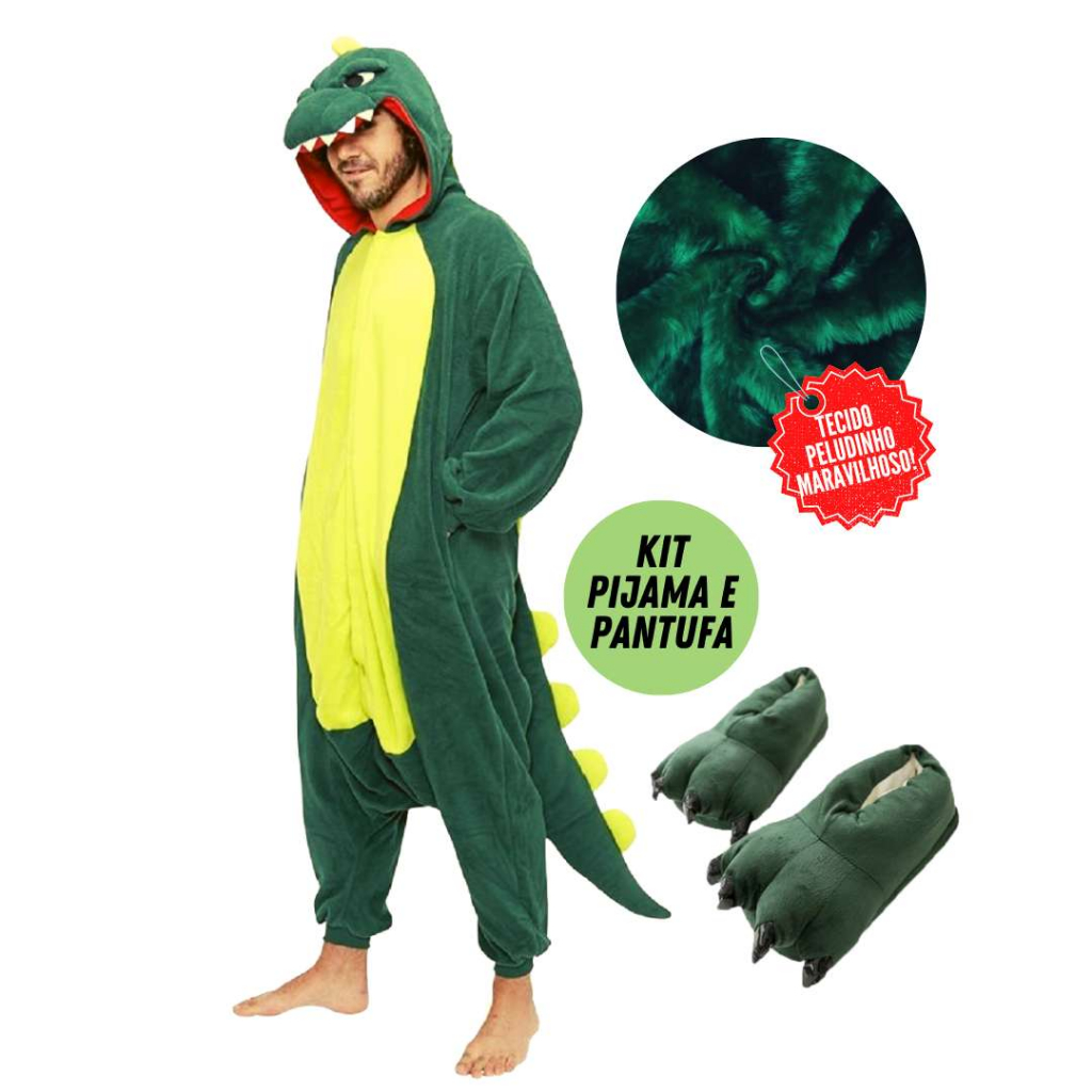 Kit Pijama com Pantufa Dinossauro Jacaré Kigurumi Confortável Pelúcia Flanela Macacão com Capuz Roupa de Dormir