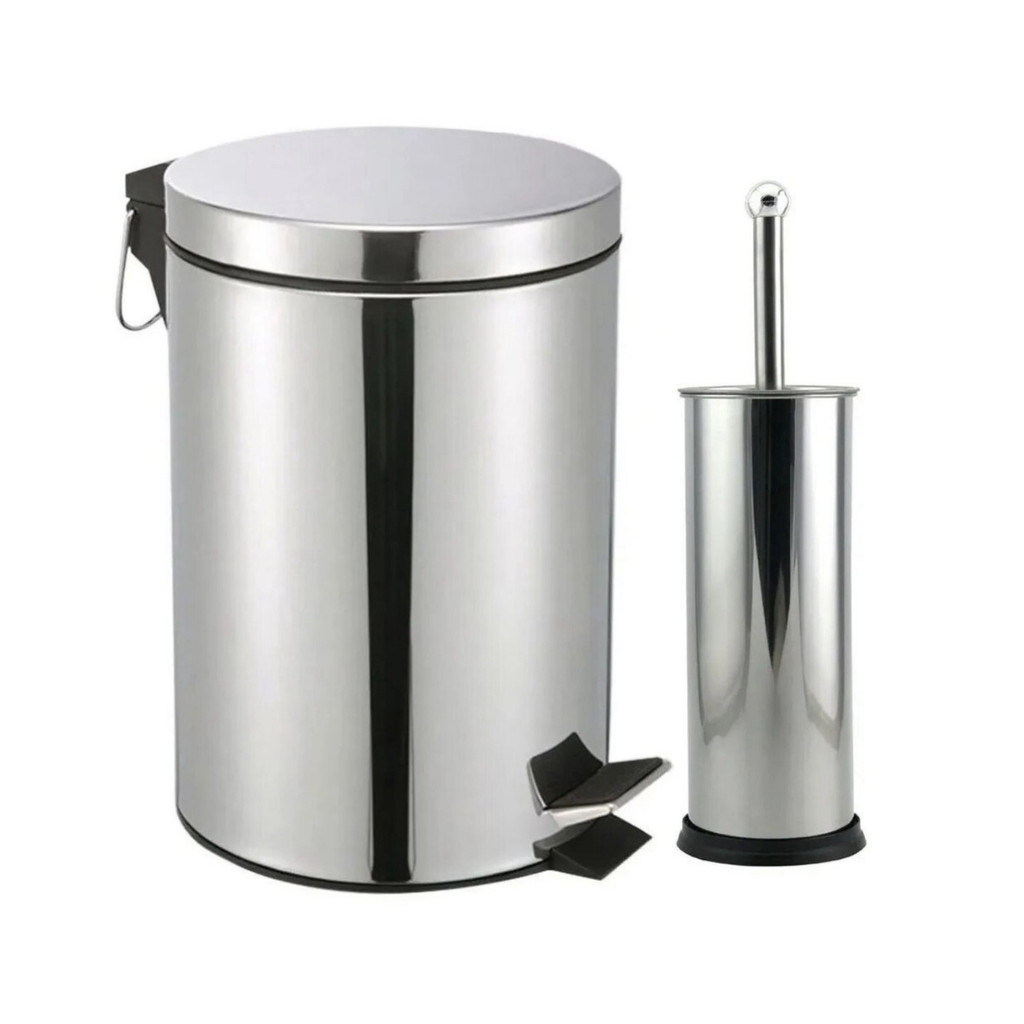 Kit Banheiro 2 Peças Lixeira 5 Litros E Escova Sanitária Inox Prata Multiuso Moderno