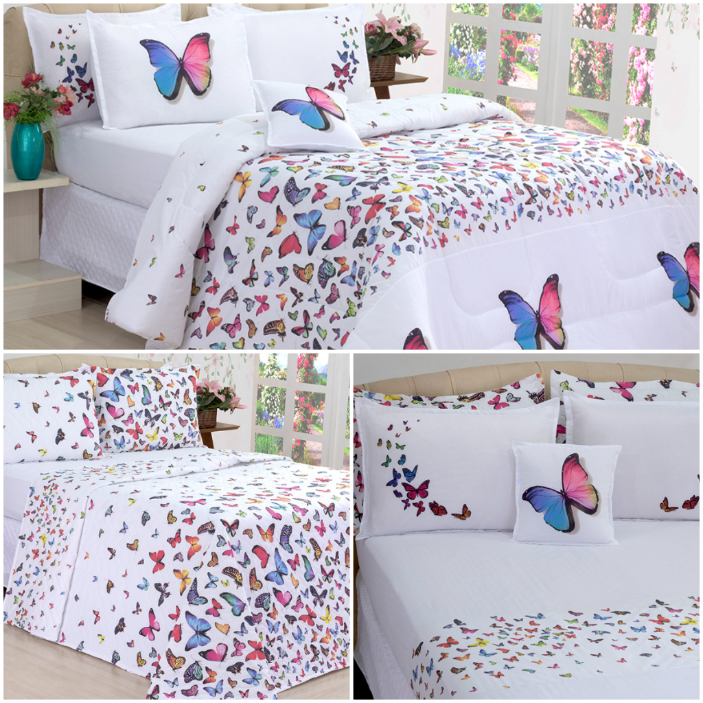 Kit edredon borboletas percal 180 fios dupla face queen size 04 pçs