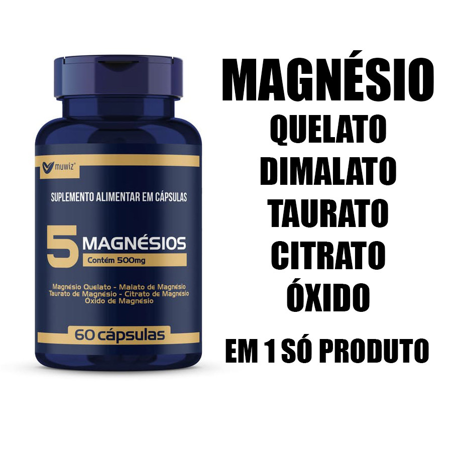 5 Magnésios Muwiz 60 Cápsulas 500mg (C/ Quelato + Malato + Taurato + Citrato + Oxido de Magnésio) - Envio Rápido