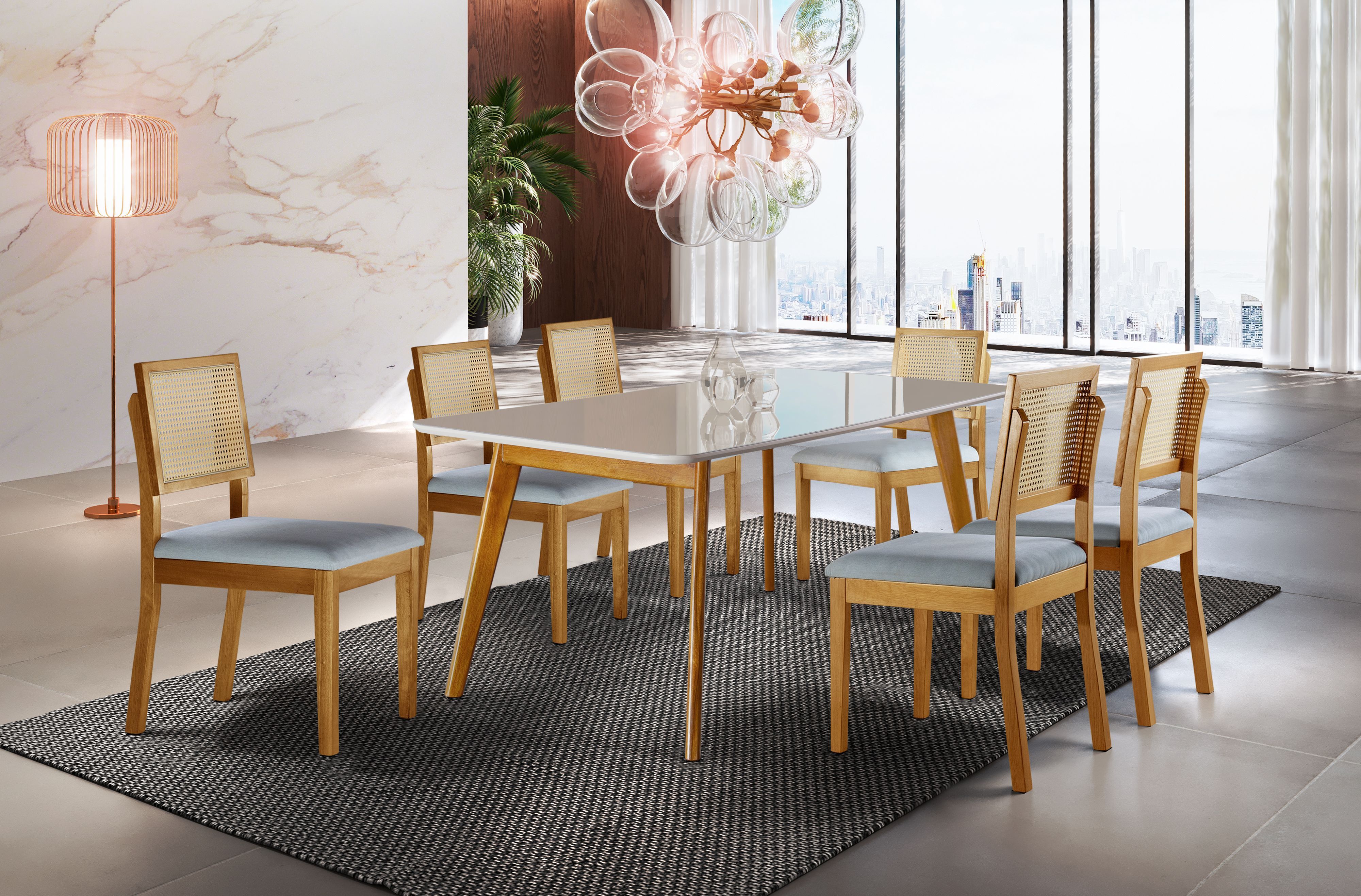 Conjunto Sala de Jantar 6 Lugares Aline Mesa e Cadeiras Madeira Maciça Encosto Telinha