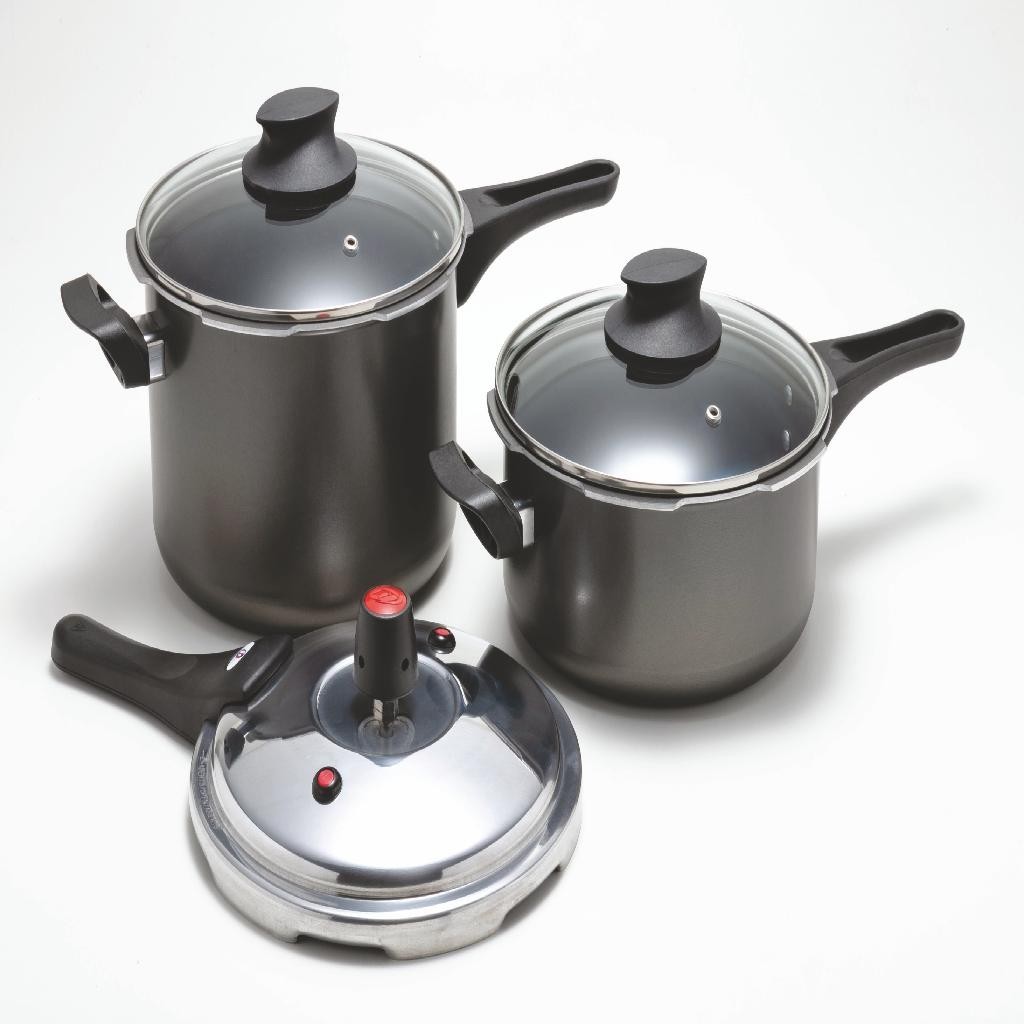 Kit Jogo de Panelas de Pressão 3L e 4,5L com fechamento externo e tampa de vidro temperado p/ servir
