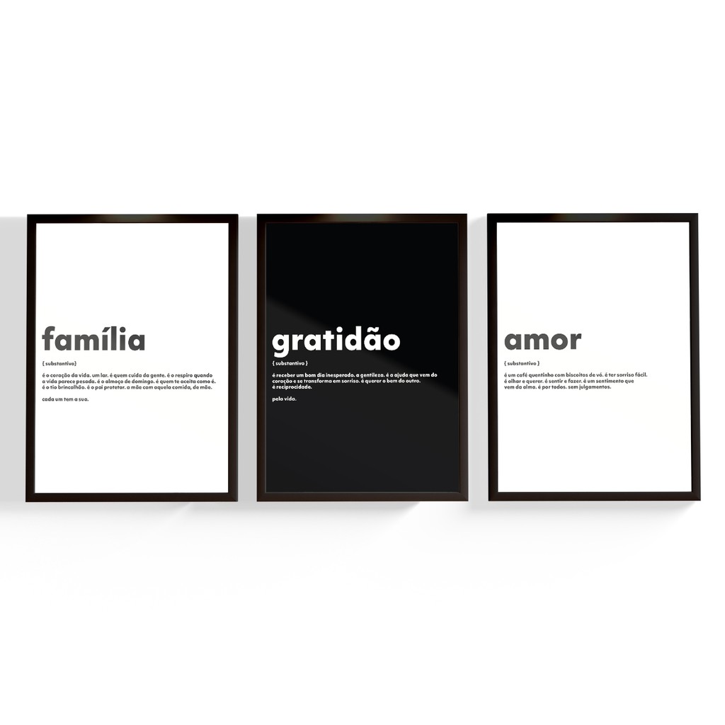 Kit Quadros Decorativos Sala Com Moldura e Vidro Frase Família Amor Gratidão