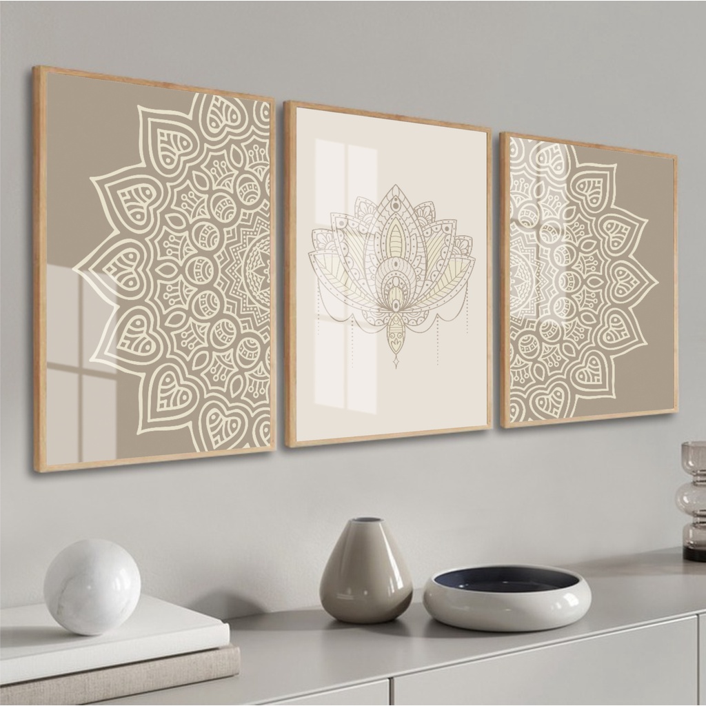 Kit 3 Quadros Decorativos Mandala Moderno Boho Para Quarto Sala Casa Com Moldura e Vidro