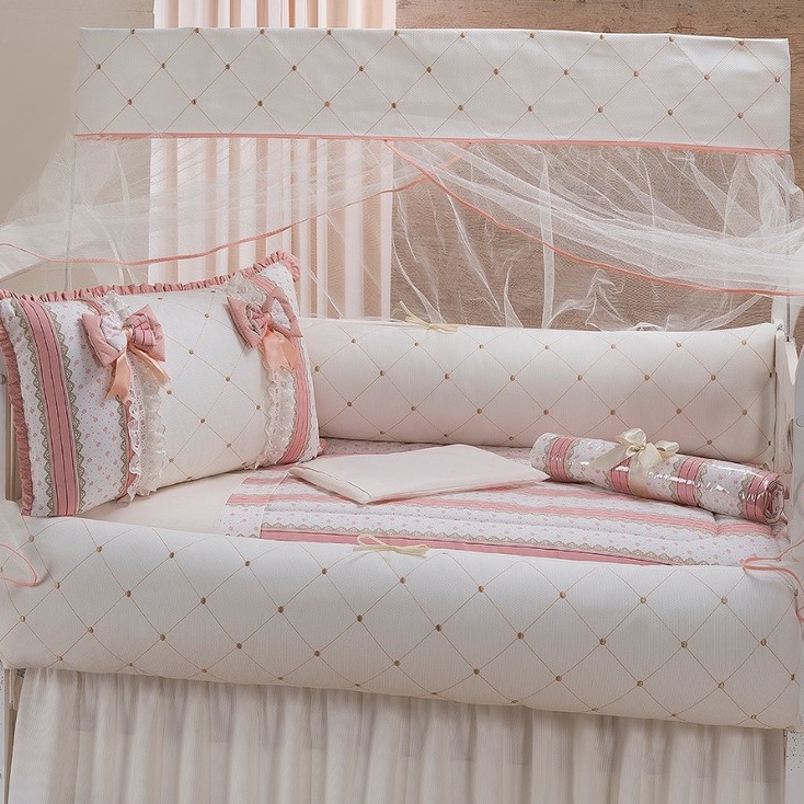 Kit Berço Trança Menina Completo Padrão Nacional E Americano 9 Peças Modelo Tranca Rosê Floral Rosa Pink Neutro Nuvem Amor Protetor Rolinho Lateral Berço para bebê Enxoval para berço - Promoção