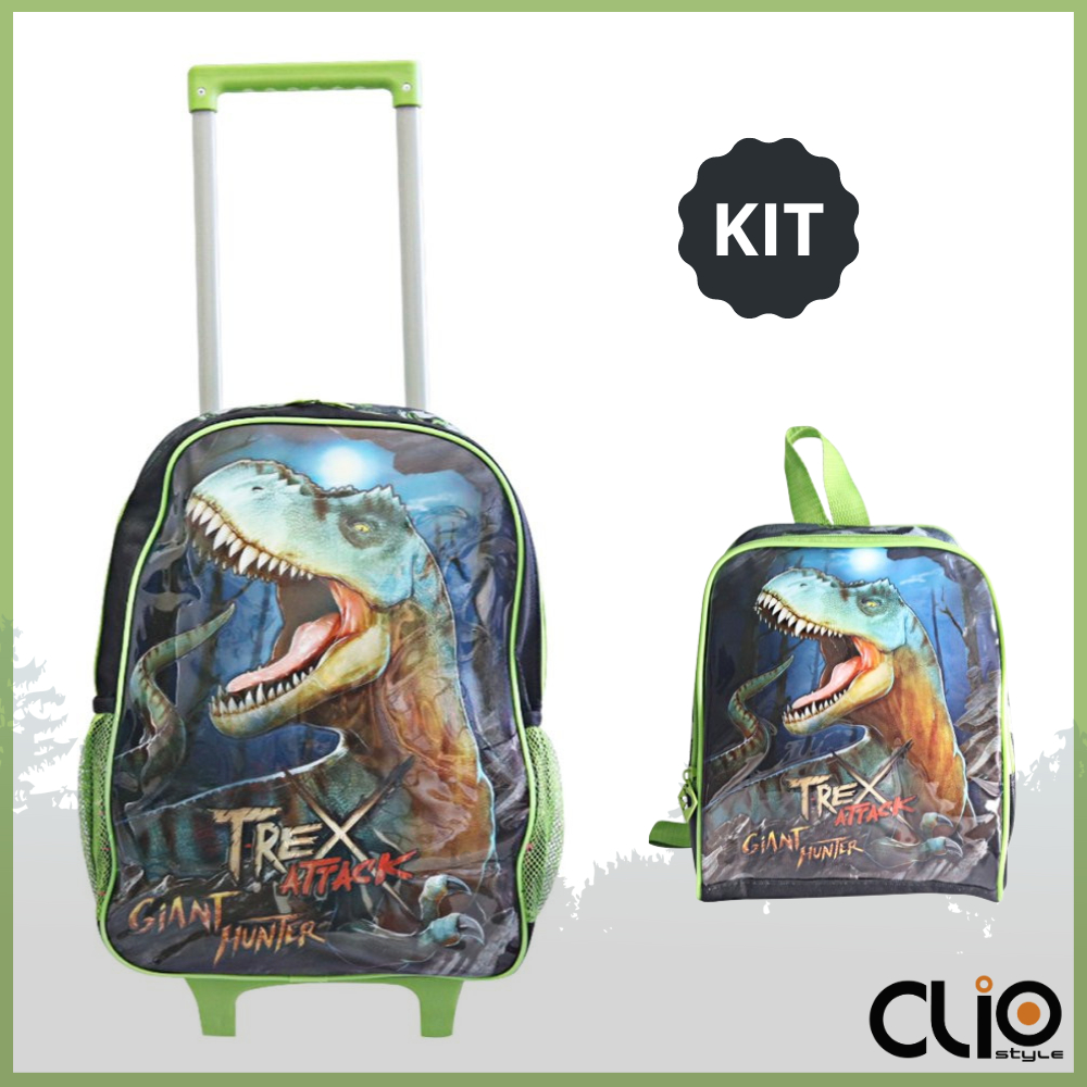Kit Mochila de Rodinha e Lancheira Escolar Infantil Menino Dinossauro T-Rex