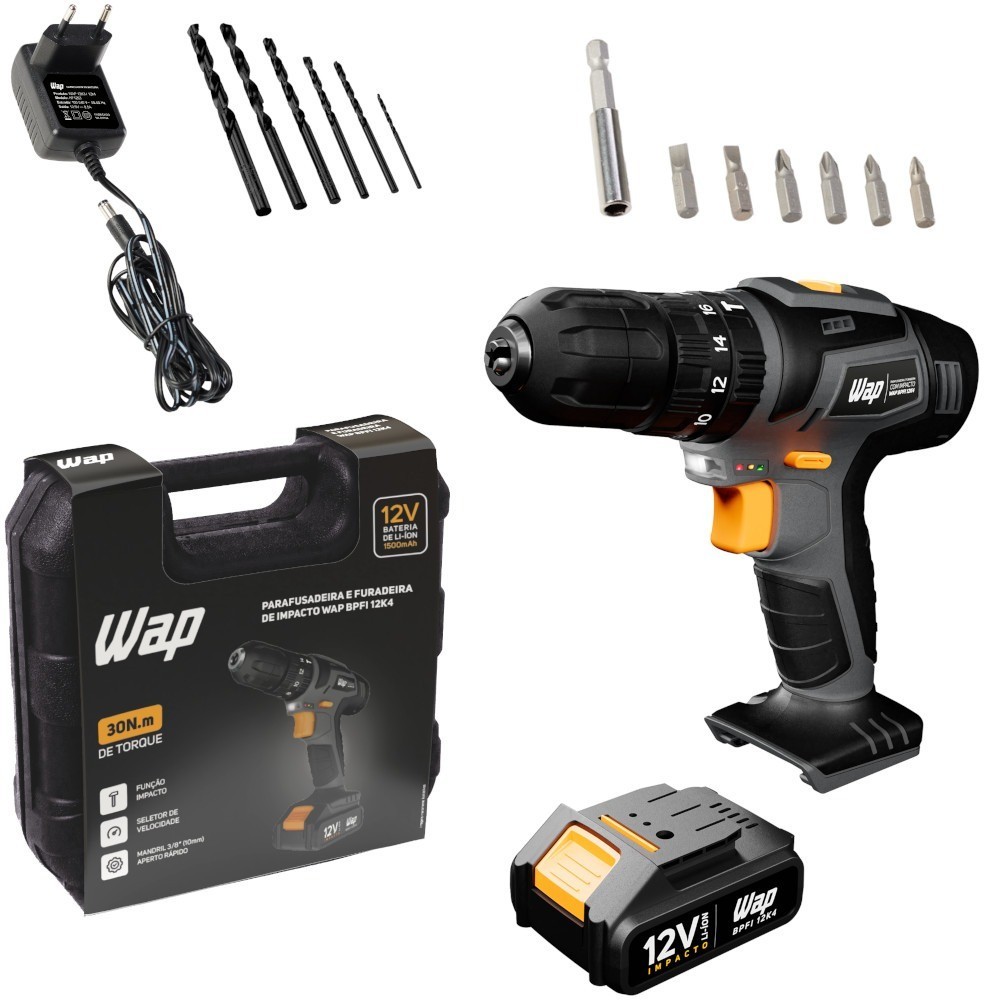 Furadeira Parafusadeira de impacto 3/8" a bateria 12V com kit de brocas e bits - BPFI 12K4 - Wap