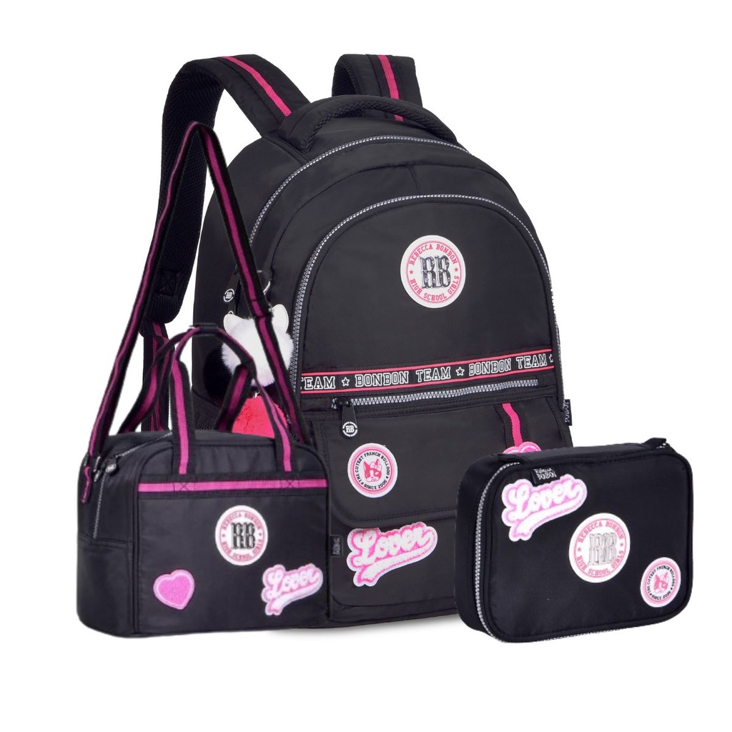 Kit Escolar Mochila Feminina Rebecca Bonbon Costa Preta com Lancheira Térmica e Estojo - RB