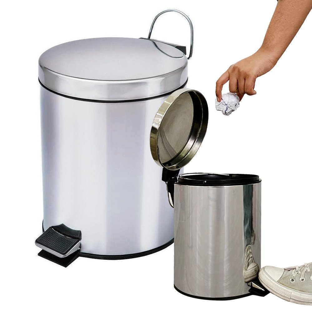 Kit Banheiro Lixeira Inox Com Pedal E Tampa 5 Litros 5L + Escova Sanitária Em Aço Inox Para Limpeza Higienização De Vaso