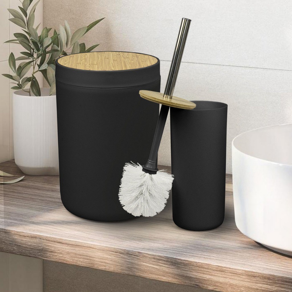 Kit Para Banheiro 2 peças com Lixeira e Escova Sanitária - Plástico e Bambu
