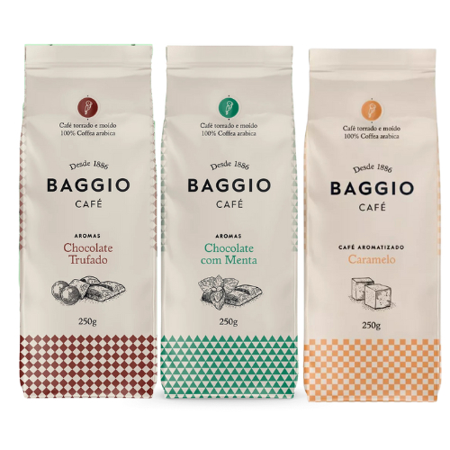 Kit de Cafés Moídos Aromas Baggio Café 1kg Caramelo Chocolate Trufado Chocolate com Avelã Chocolate com Menta