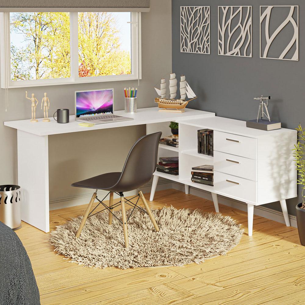 Escrivaninha Mesa de Escritório de Canto 3 Gavetas Branca Lisboa Madesa