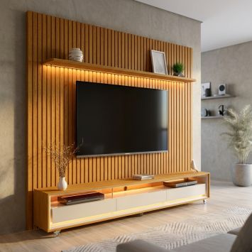 Rack com Painel Ripado até 70 Polegadas Sintra com LED 3 GV Cedro e Off White Alt 218 Larg 222 cm
