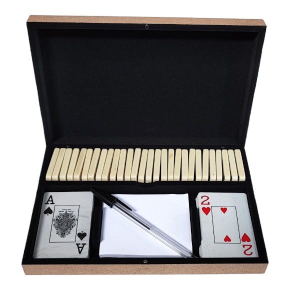 Caixa Estojo para 2 baralhos e 1 jogo de dominó em mdf cru e interior aveludado em veludo preto 4580