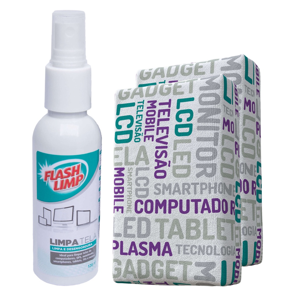 Kit com 2 Esponjas Microfibra e 1 Limpa Telas Spray 120ml, Estampas Sortidas, Flash Limp