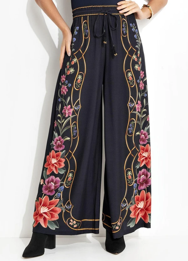 Farm - Calça Pantalona Floral Belle Preto