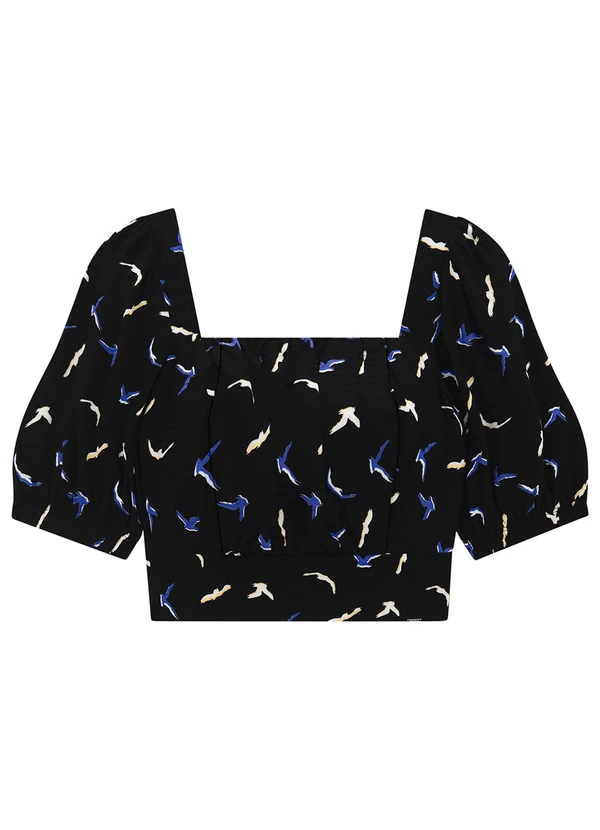 Lunender - Blusa Cropped Estampada com Manga Bufante Preto