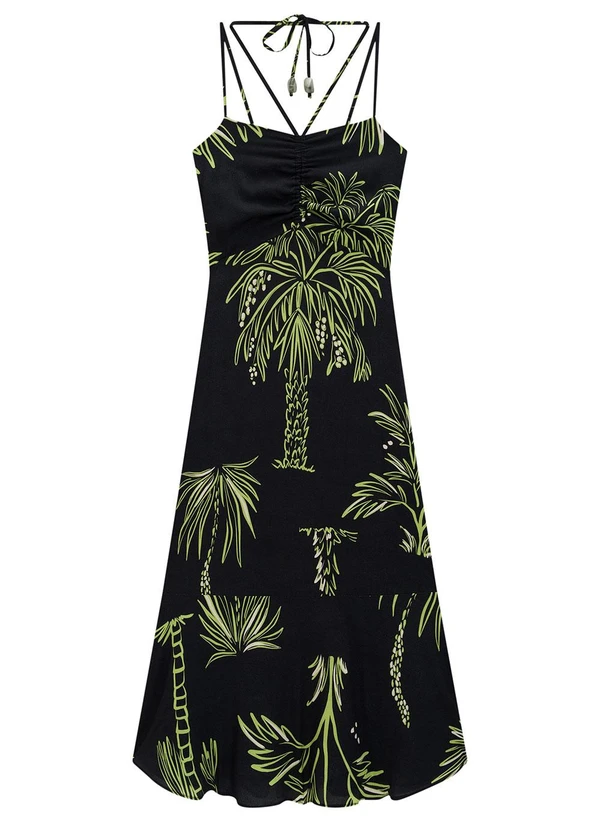 Lunender - Vestido Midi Estampado com Amarração Preto