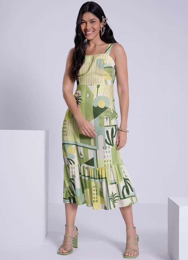 Lunender - Vestido Midi Estampado em Viscose Verde