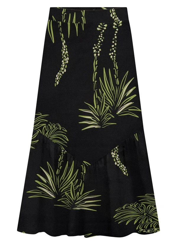 Lunender - Saia Midi Estampada em Viscose com Babado Preto