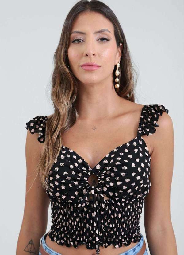 Pop Me - Blusa Cropped em Viscose Alca com Busto Vazado Estampa Bicolor Preto