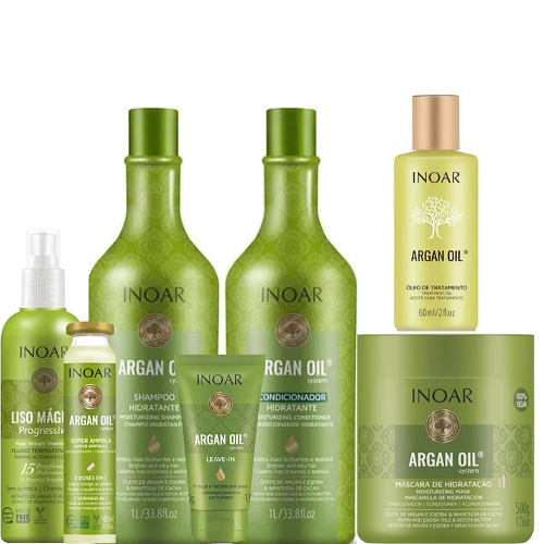 KIT INOAR ARGAN SH 1L+COND1L+MÁSCARA 500G+FLUIDO MÁGICO200ML+OLEO 60ML+LEAVE-IN50G+AMPOLA45ML