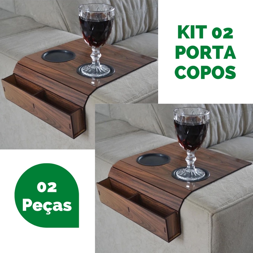 Kit 02 Esteiras Porta Copos e Com Porta Controle Para Braço Sofá em Madeira Premium MDF