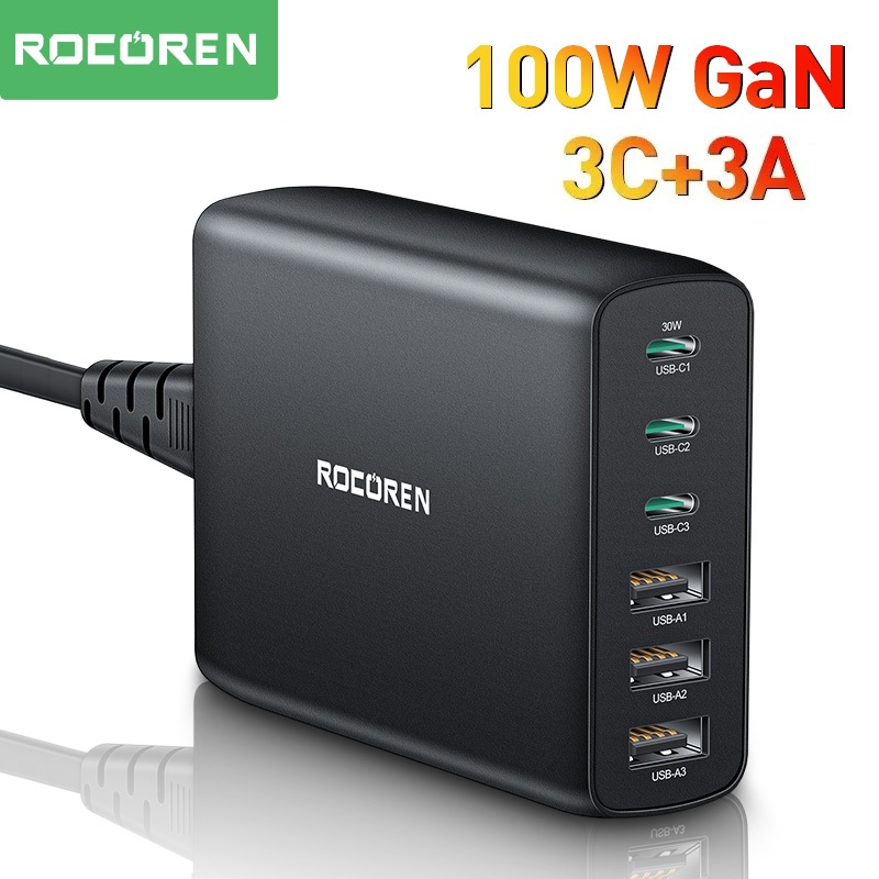 Carregador Rápido Rocoren 100W GaN 6 Portas USB Tipo C PD3.0 Estação De Carregamento Múltiplo De Mesa Para i15 Sangsung S24