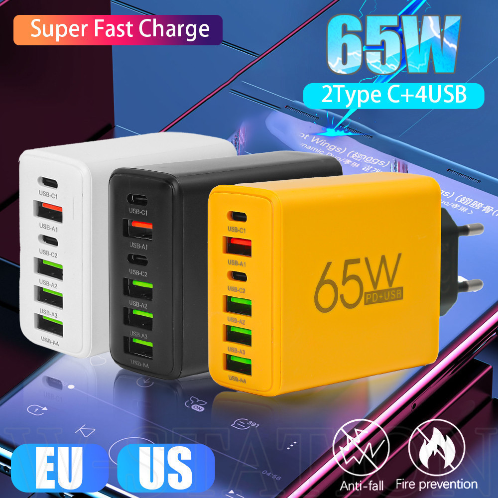 Conjunto Carregador De 6 Portas De 65W-Bloco Parede Rápido Tipo C USB-Estação De Carregamento PD Para Múltiplos Dispositivos-Adaptador De Energia Do GaN-Telefone , Mesa , Laptop