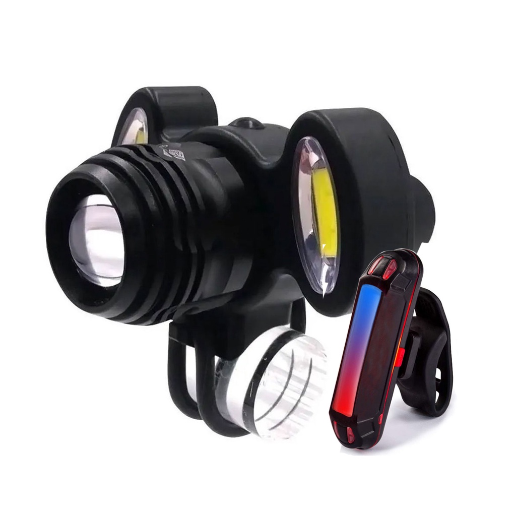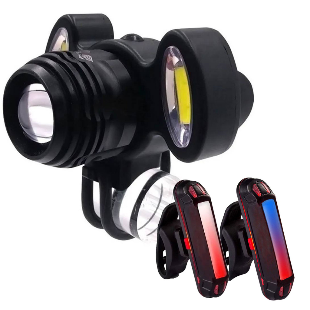 Farol Lanterna 3 Focos Bike Led Zoom Recarregável + Sinalizador Traseira Bike Led Recarregável Usb