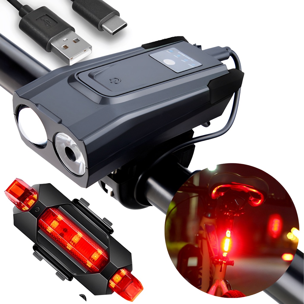 Farol Led Buzina Recarregável Usb 250 Lumens T6 + Farol Traseiro Sinalizador Bike Recarregável Lanterna Pisca
