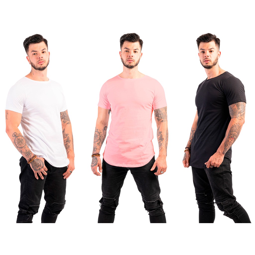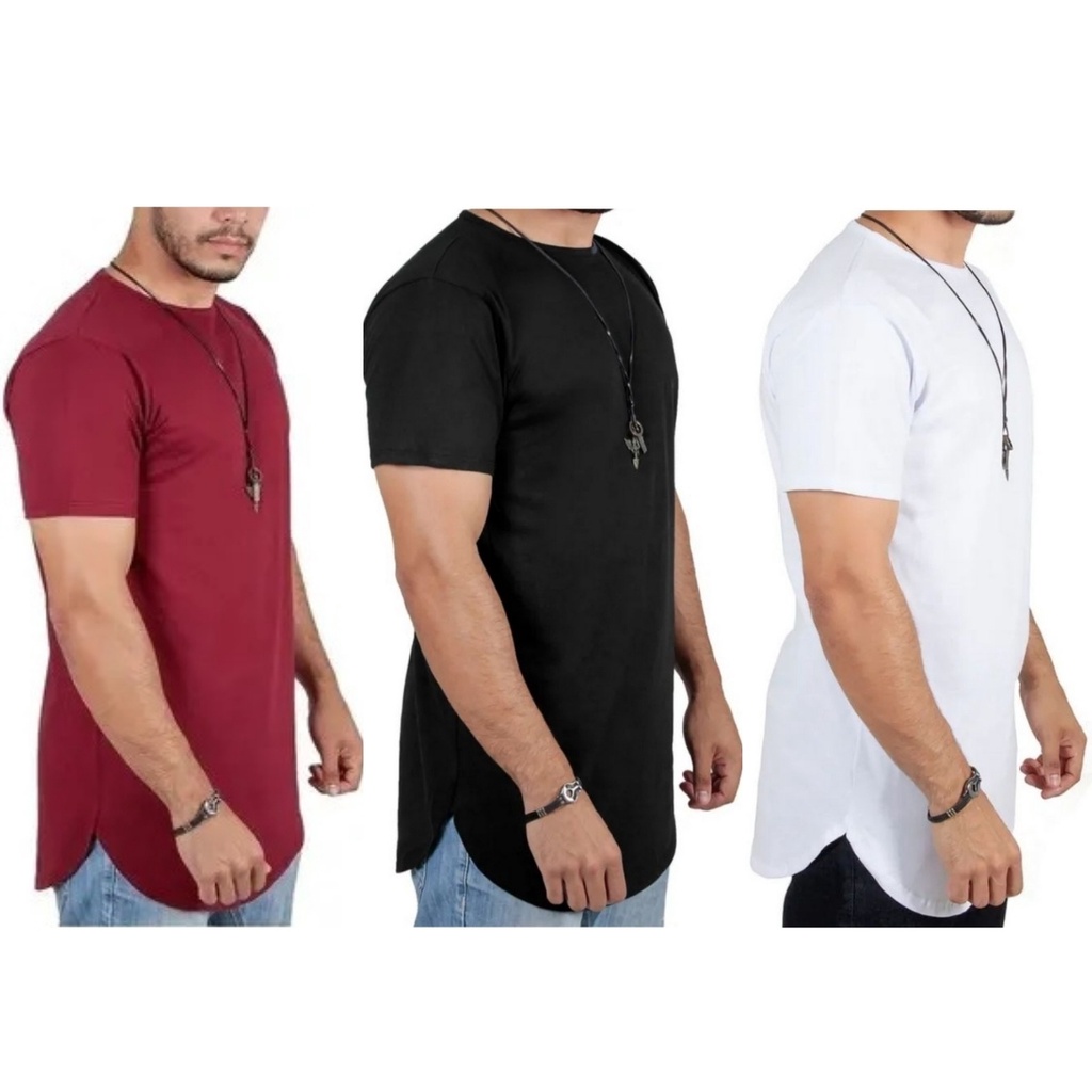 Kit 3 Camiseta Masculina Long Line Lisa Básica 100% Algodão Promoção