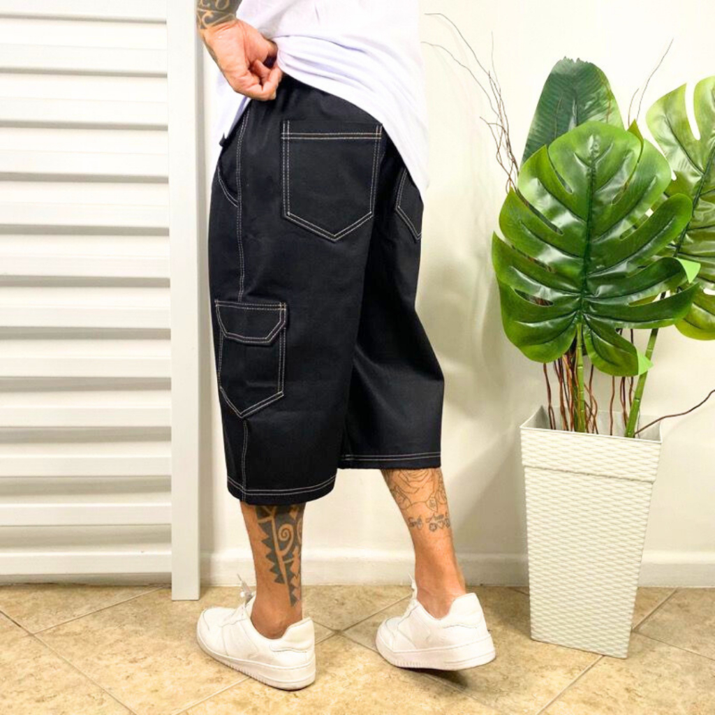 Bermuda Cargo Corta Vento Tactel Masculina Larga Bolso Lateral Preta Sarja Skate Streetwear Oversized