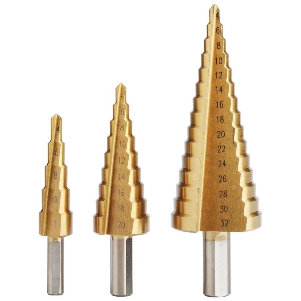 Kit Jogo 3 Brocas Escalonadas Cônicas de Titânio 4-12 4-20 4-32mm Espiral Hss