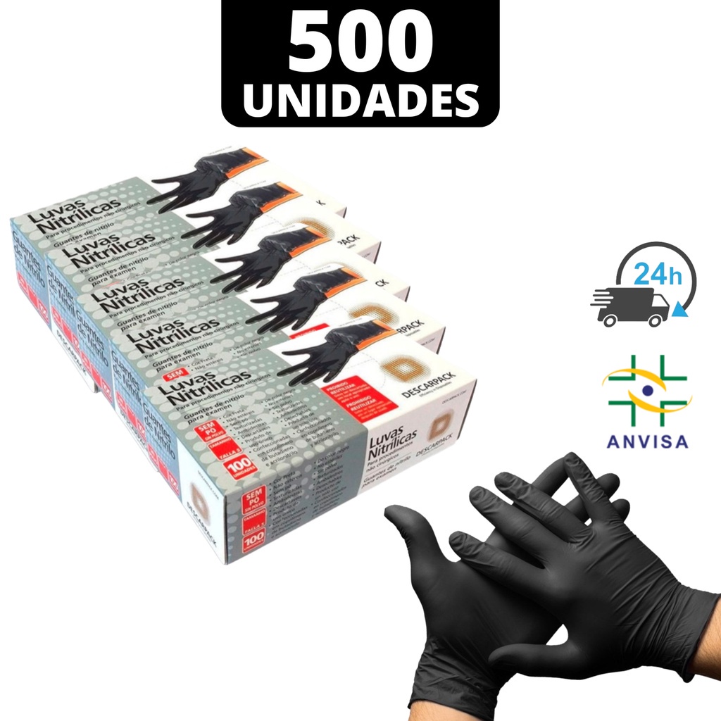 Luva Nitrilica Preta Descartável Procedimento Sem Pó 5 Caixas 500 Unidades Anvisa Nitrílo Caixa com 100 Unidades