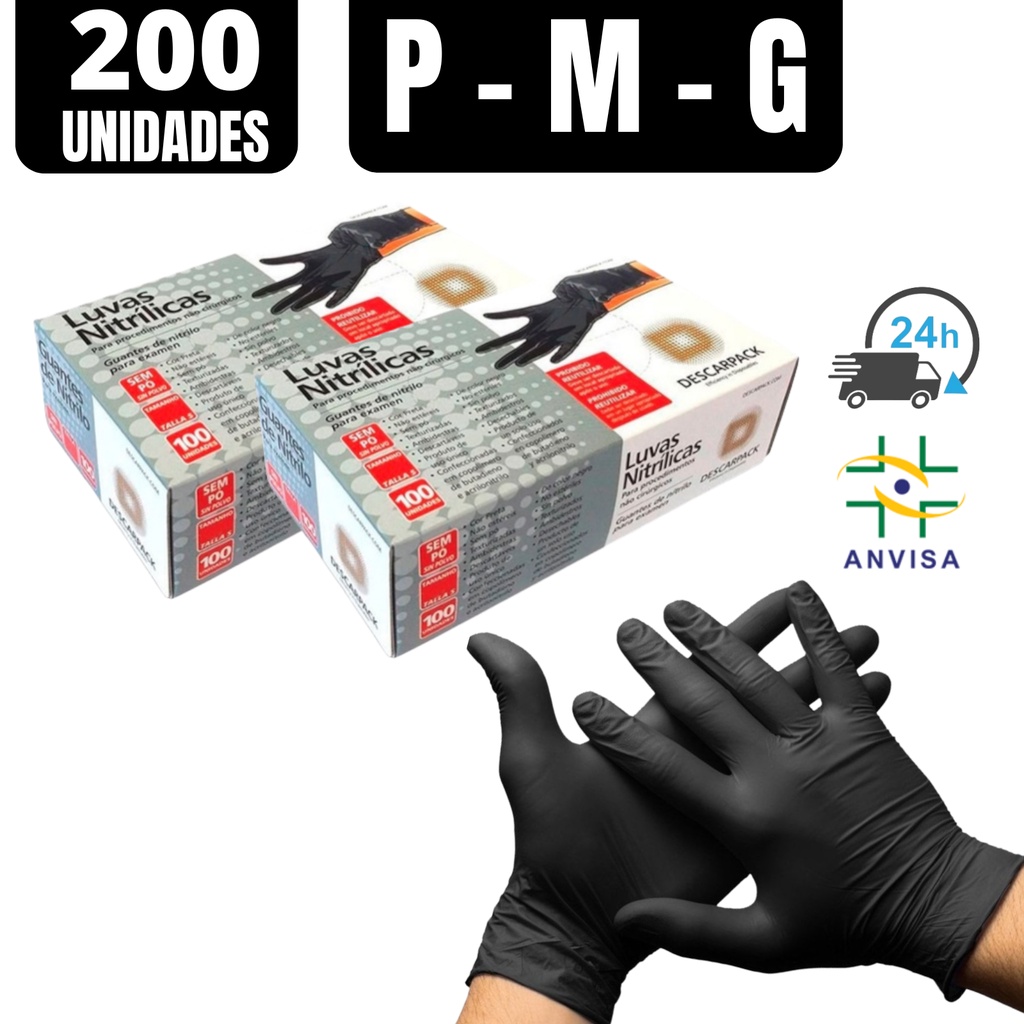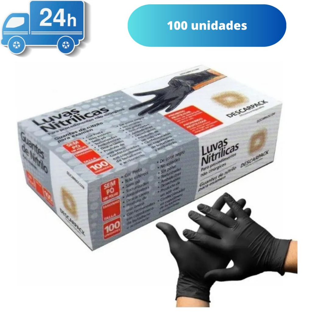 Luva Nitrílica Nitrílo Preta Descartável Sem Pó Descarpack C/100 Unidades Anvisa