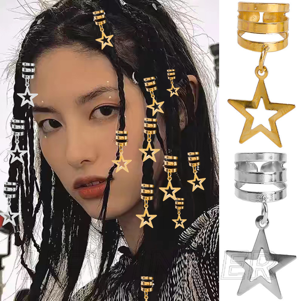 10Pcs Anel Metálico Para Cabelos-Punk , Hip-Hop , Moda-Fivela De Trançado Sujo-Ajustável-Ferramenta Trançar Acessórios Decoração De Bricolage-Contas Dreadlocks Em Forma De Estrela