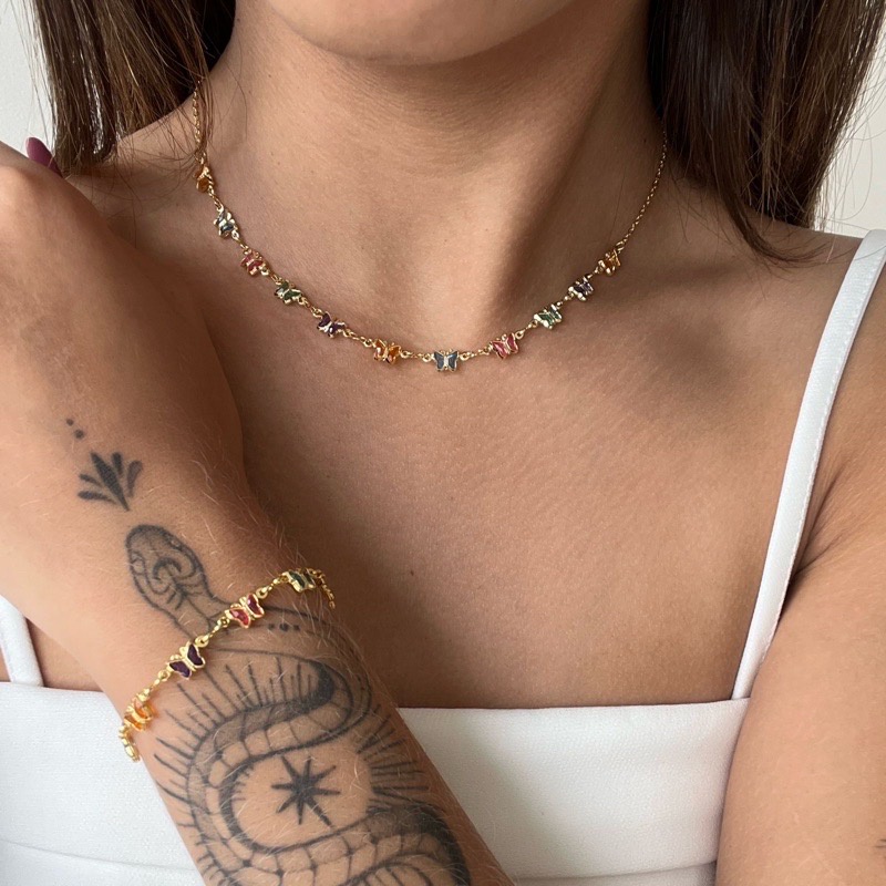 Kit Conjunto Colar Choker e Pulseira de Borboleta Colorida Folheado Banhado A Ouro 18k